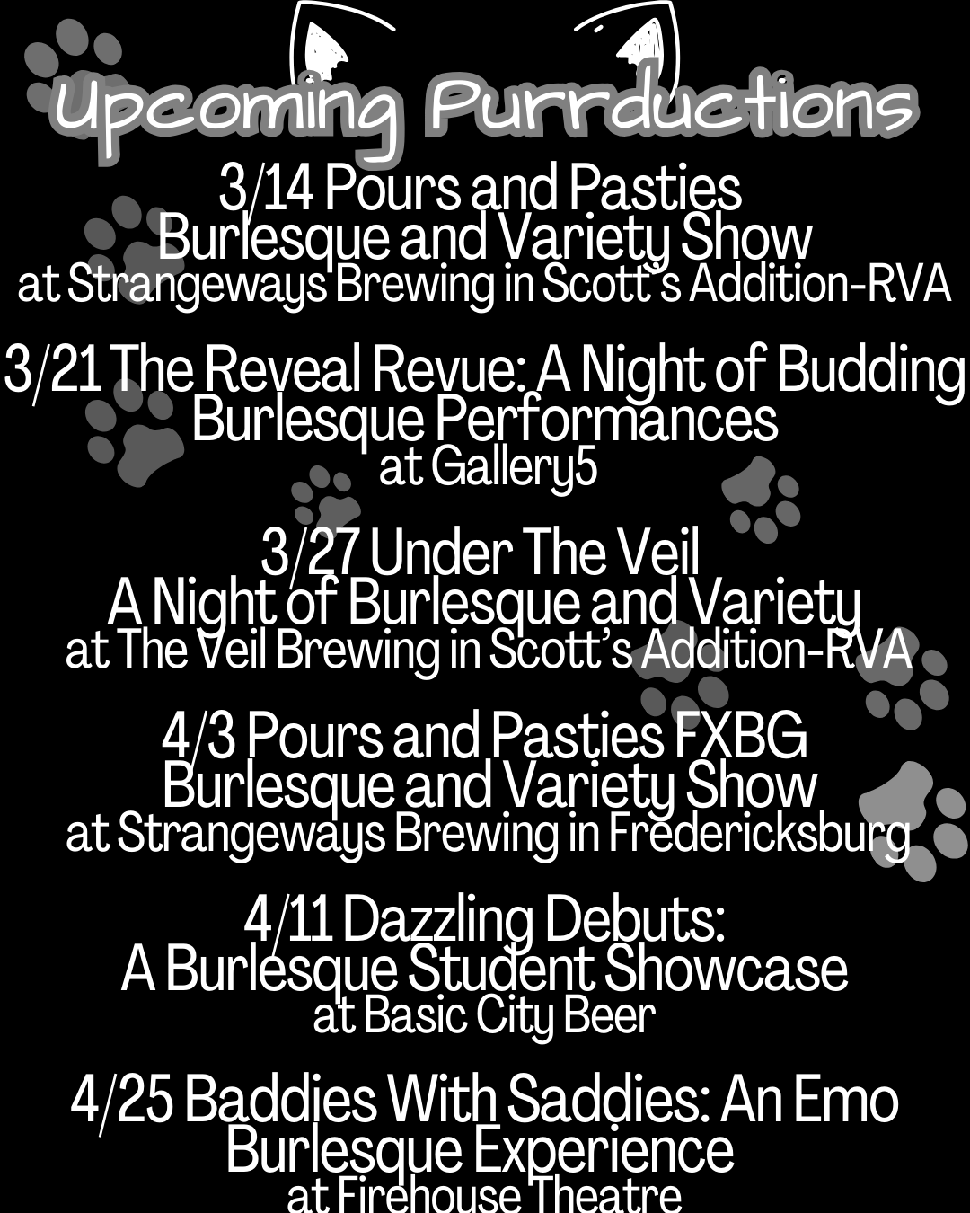 Burlesque Right Meow Productions brings you a mix of glamour, laughter, and unforgettable entertainment! Based in Richmond, we specialize in burlesque and variety shows that celebrate the art of tease with style and charm.